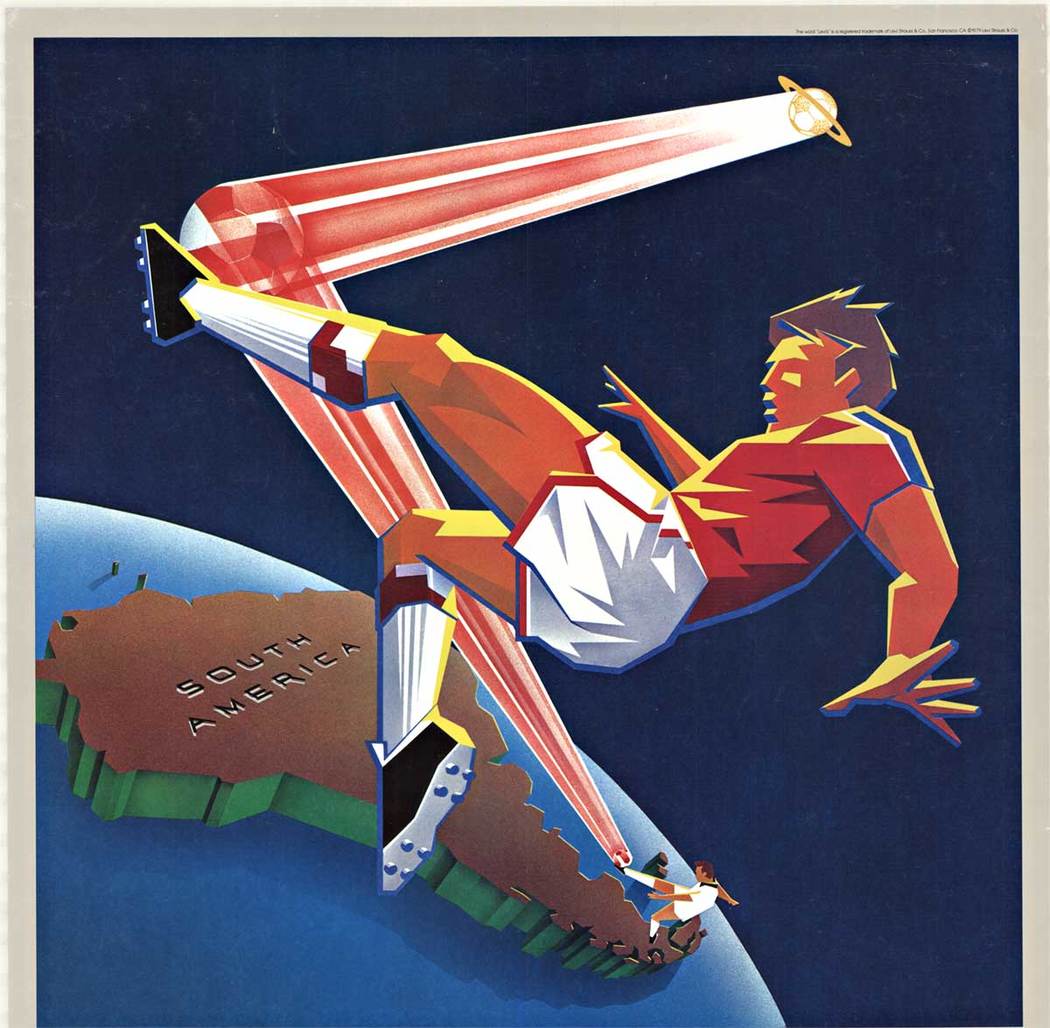 Original 1980 Olympic Soccer Poster – South America by Levi Strauss. This image features a soccer player over the map of South America. Micro script trademark for Levi’s appears on the top right border. This is the Original Lithograph Vintage Poster and represents an extremely rare original first printing from a commissioned series of six posters associated with the Levi’s Olympic promotion.