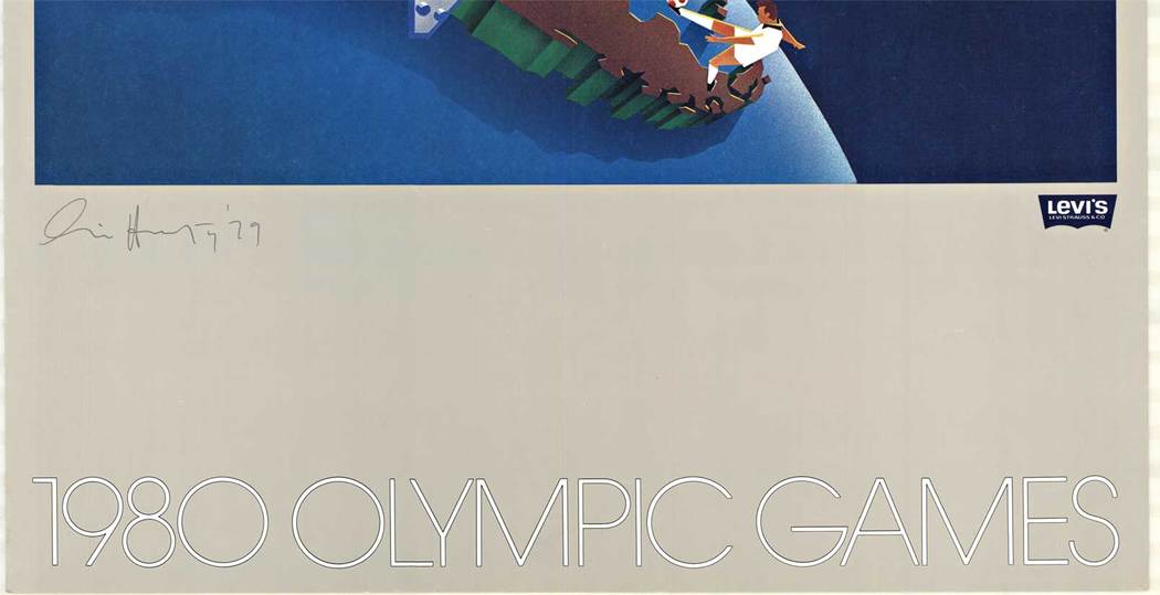 This poster belongs to a series of six commissioned by Levi’s as official sponsors for the US team for the 1980 Olympic Games. Each poster emphasized the sport associated with one of the six continents, and records indicate a trial run level of distribution, with limited exposure due to Levi’s abandoning the Moscow promotion when the US pulled out to protest the Soviet Union’s invasion of Afghanistan. Hand signed in pencil at the lower left; signature is illegible and the published name is not available from auctions.