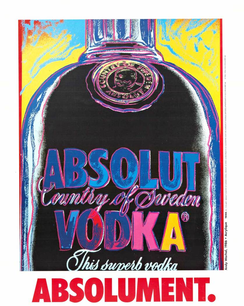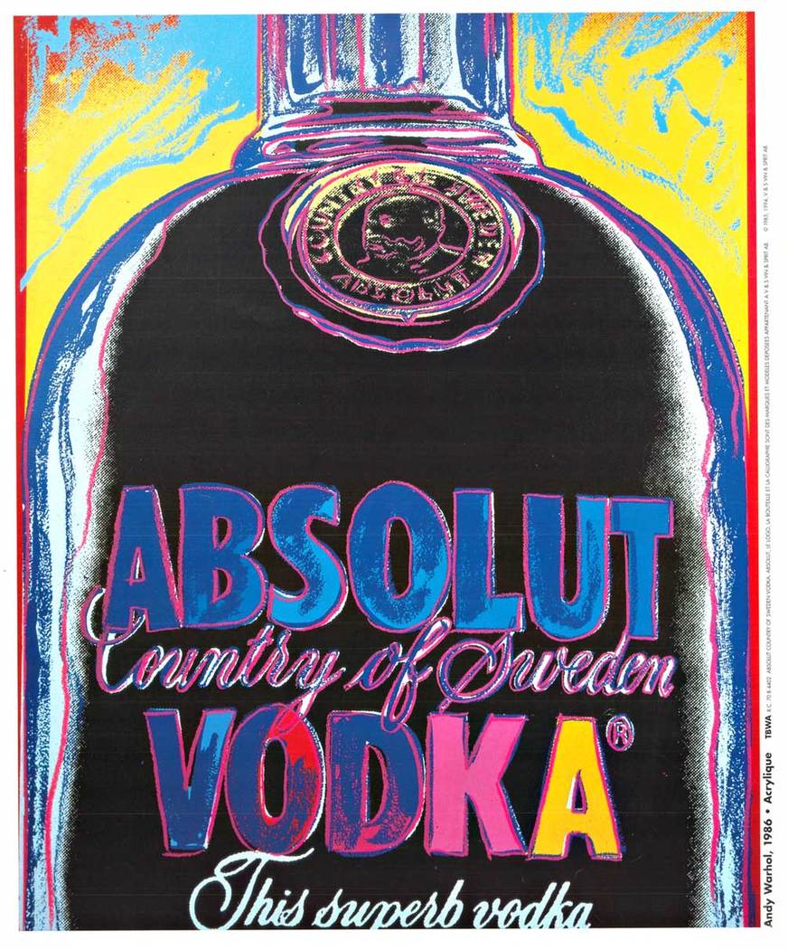 Warhol created the original Absolut Vodka series in the mid-1980s. The vibrant palette of electric blues, magentas, and golden yellows is quintessential Warhol: bold, accessible, and utterly captivating. The iconic bottle renders in his signature flat color blocks, radiating with unmistakable energy.