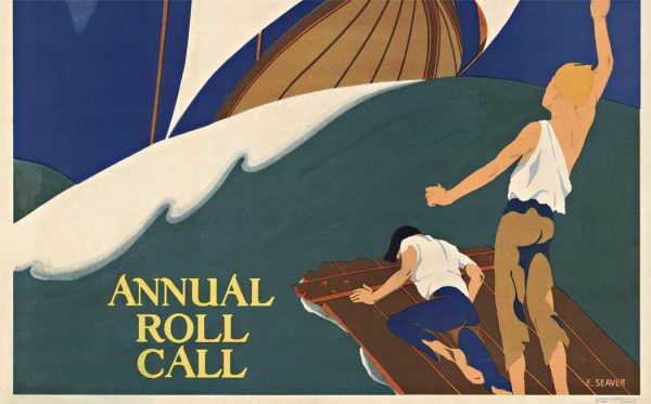 With the red cross ship sailing on the horizon in this image, the two lost survivors floating on wooden planks out at sea can now be rescued. Saved by the Red Cross. Possibly a different outlook during wartime on “Loose Lips Sink Ships.” Very little information is documented about this artist.