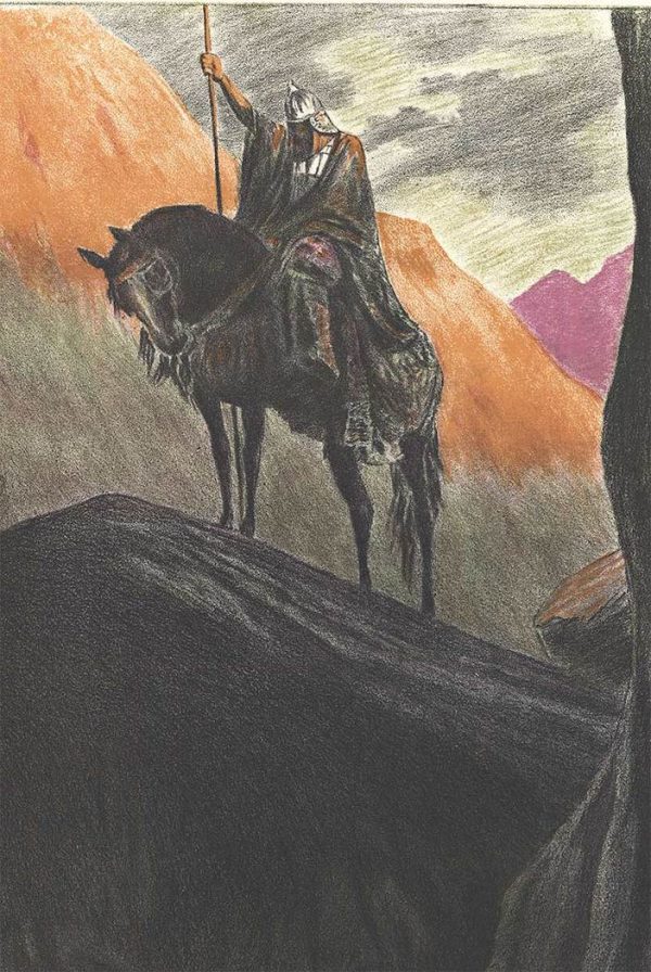 The image features a medevil design with a knight and his horse on a large rock. The rocky landscape are beautifully colors. In the valley is a battle scene.