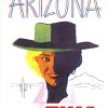 A frontal bust dominates the sheet, bisected into warm orange and deep violet shadow. The hat forms a wide horizontal anchor, while spare line drawings of cactus and mesas sit low on the horizon, emphasizing scale and place without clutter. The “ARIZONA” title crowns the image in airy lettering; the red TWA mark grounds it below.