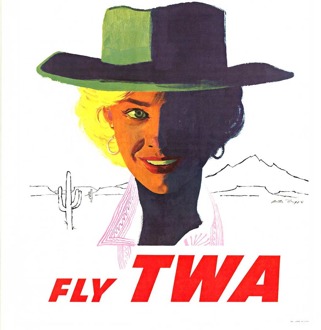 A bold, graphic portrait distills the Southwest into a single, unforgettable figure. Austin Briggs splits the cowgirl’s face into light and shadow, pairing saturated color with a stark white field and minimal desert linework. The oversized hat and direct gaze project both glamour and frontier myth, calibrated for the jet-age traveler. Among TWA’s regional posters, this is one of the most visually assertive.