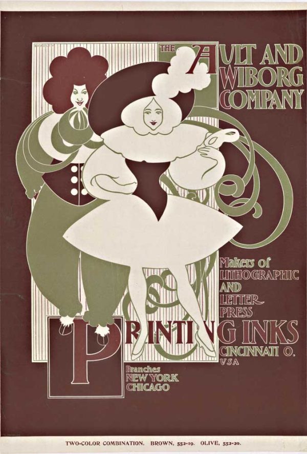 Original 1896 printing of Will Bradley’s image for Ault and Wibourg Company. This image has been linen backed to insure a long life and is ready for framing. (This poster is also part of Wolfsonian-fiu Library) Very fine condition; ready to frame.