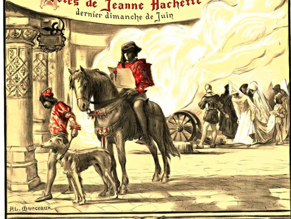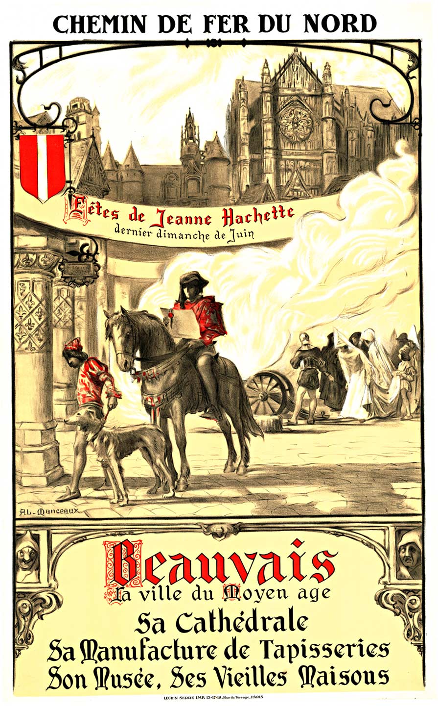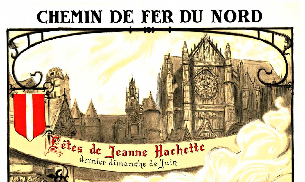 Above the scene appears the banner “Fêtes de Jeanne Hachette – dernier dimanche de Juin”, referencing the famous annual festival honoring Jeanne Hachette, the heroine who helped defend Beauvais during the Burgundian siege of 1472. The festival remains one of the most celebrated historic traditions of the city.