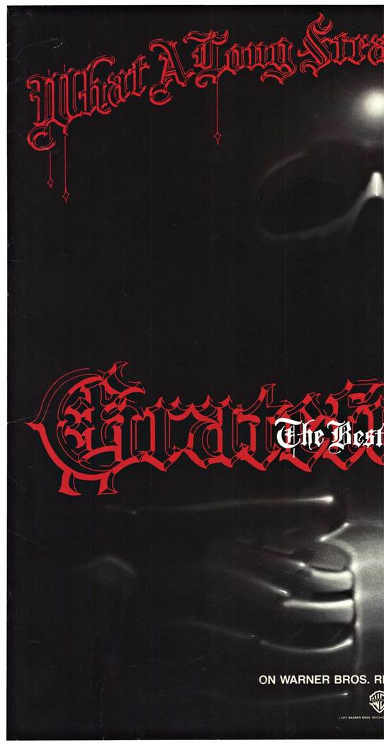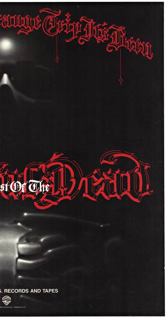 A powerful original linen-backed The Best of the Grateful Dead vintage poster, printed by Warner Brothers, presented as a conservation-minded piece from a legendary era of the band. The image is built around a deep black field, with ominous, hidden details—peering out from the darkness is a skull and an alien-style rib cage, giving the artwork a haunting, surreal edge.