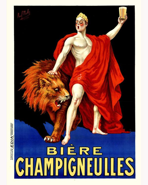 Bière Champigneulles antique poster (Paul Mohr) — circa 1925 is an original large-format French advertising lithograph from the 1920s, printed by Affiches Edia, Paris. Designed by Paul Mohr (1890–1959), this rare beer poster is a premier example of early 20th-century French stone-lithography style and dramatic, “heroic” alcohol advertising.