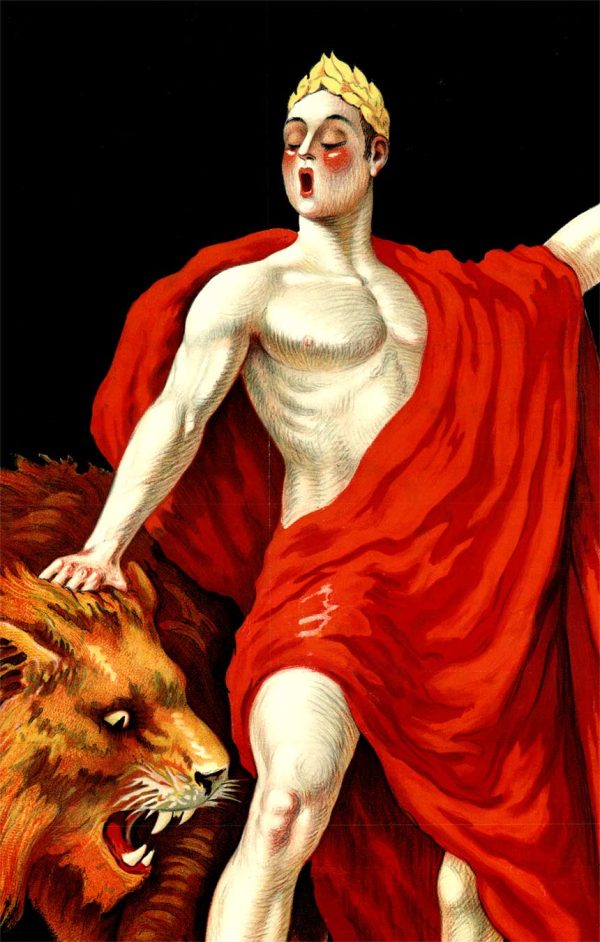 The artwork features a powerful, classically inspired figure—draped in a vivid red toga—standing triumphantly beside a majestic lion. In one hand, he holds a frothing glass of Champigneulles beer aloft, highlighting the golden, premium character of the brew. Set against a dark, moody background, the saturated reds and warm golds create a striking visual impact suited to a 1920s French brasserie or street display.