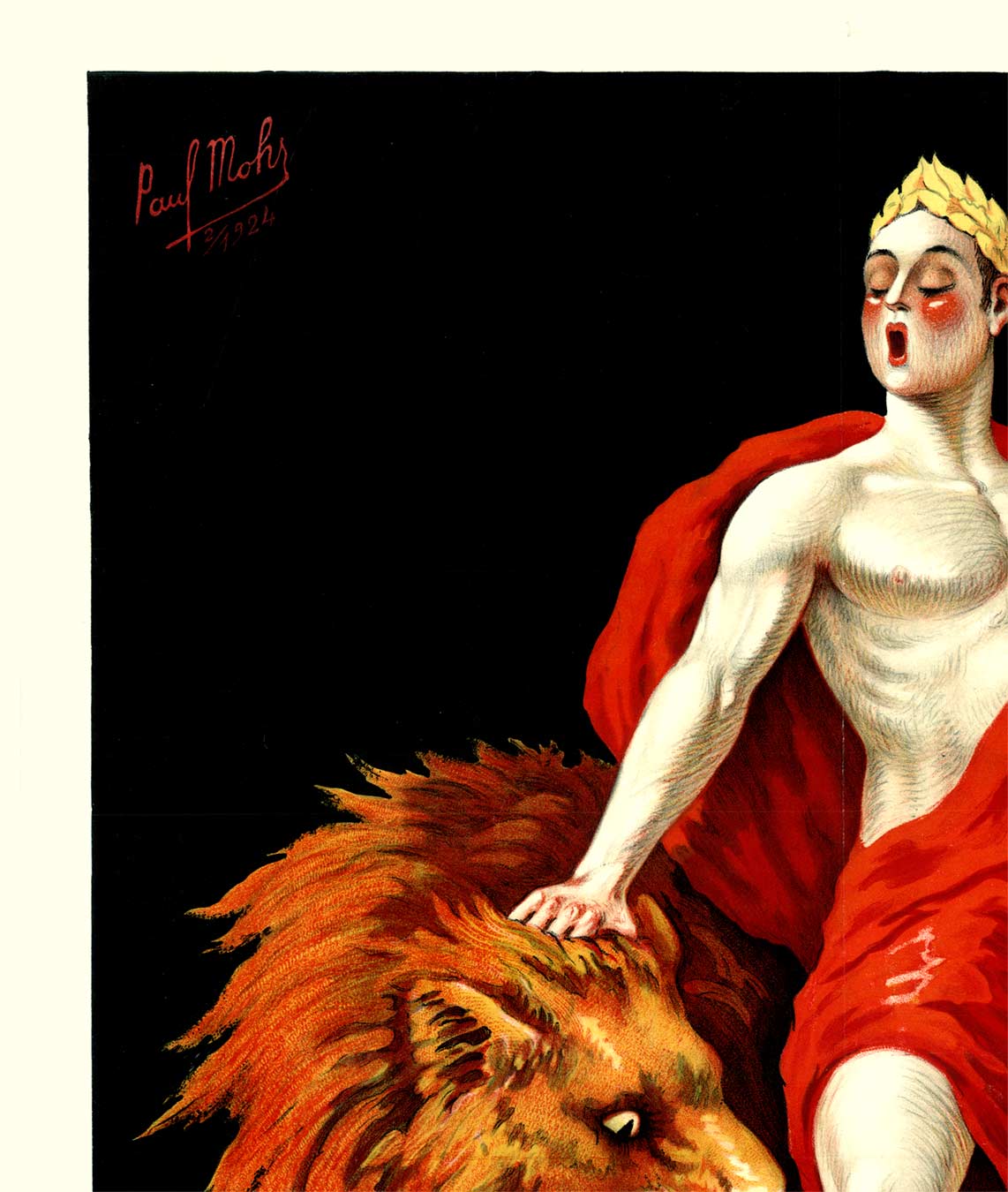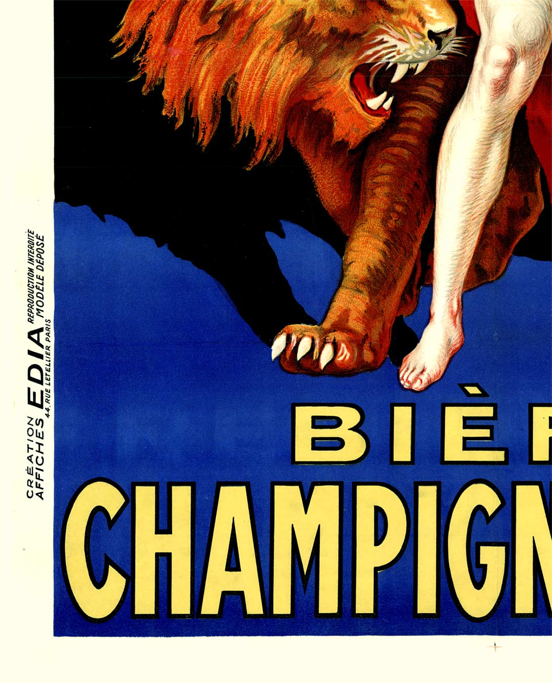 Bière Champigneulles antique poster (Paul Mohr) — circa 1925 is an original large-format French advertising lithograph from the 1920s, printed by Affiches Edia, Paris. Designed by Paul Mohr (1890–1959), this rare beer poster is a premier example of early 20th-century French stone-lithography style and dramatic, “heroic” alcohol advertising.