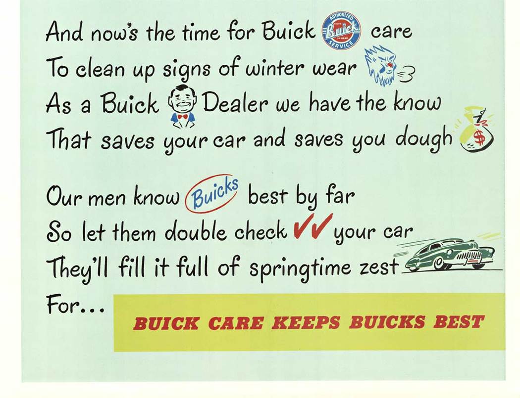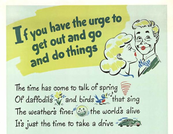 The poster’s poetic structure elevates it above typical advertising. Lines about spring, daffodils, and birds that sing establish emotional permission before introducing the Roadmaster—a sleek, racing form at the bottom, emerging from the text as an inevitable consequence. The verse rhythm carries the reader toward the call: “let them double-check your car.” The designer employs warm yellows and fresh greens to suggest renewal and vitality, a visual counterweight to wartime anxiety. Typography and illustration work as a unified emotional experience, not mere promotion.