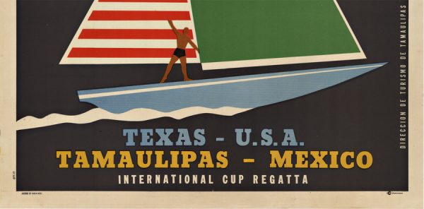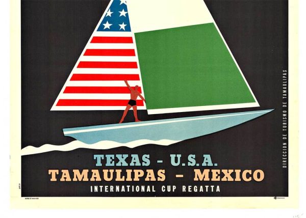 Original Mexican sailing poster advertising the “Carrera de Veleros” international regatta from Corpus Christi, Texas to Tampico, Tamaulipas, issued circa 1960s by the Office of Tourism of Tamaulipas and printed by Eco Publicistas. Executed as a lithograph, the design features a stylized sailboat whose sails incorporate the flags of the United States and Mexico, set against a modernist, high-contrast ground that emphasizes geometric form and national symbolism. The composition reflects mid-century graphic design sensibilities, combining bold color blocking with simplified maritime imagery to promote cross-border sporting events. Presented on archival linen backing, the poster is in very fine condition with strong color and a clean overall appearance.