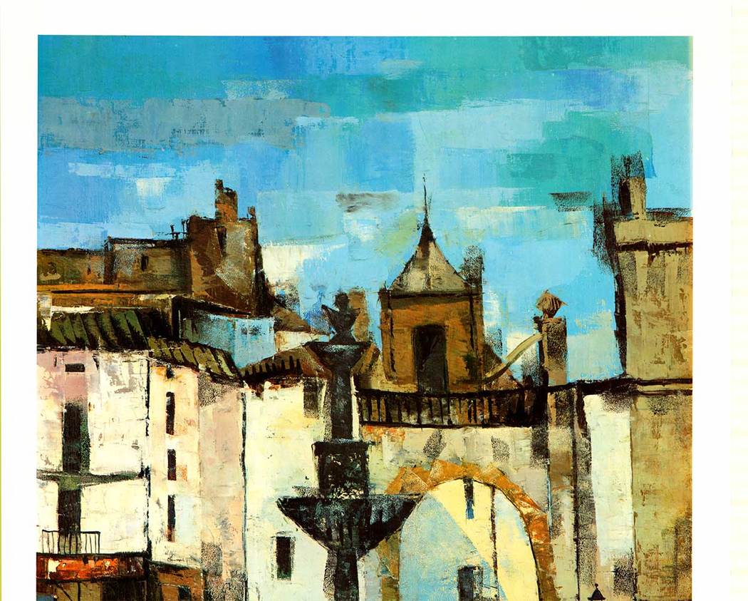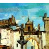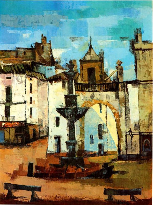 Brushwork and color further compress the image. Broad, matte applications of ochre, cream, and muted blue unify disparate structures into a continuous field, while darker accents—ironwork, shadowed openings, the fountain—punctuate the surface with rhythmic weight. The result is not a descriptive rendering of a specific site, but a constructed visual plane where architecture becomes pattern and mass rather than volume.