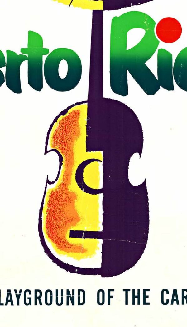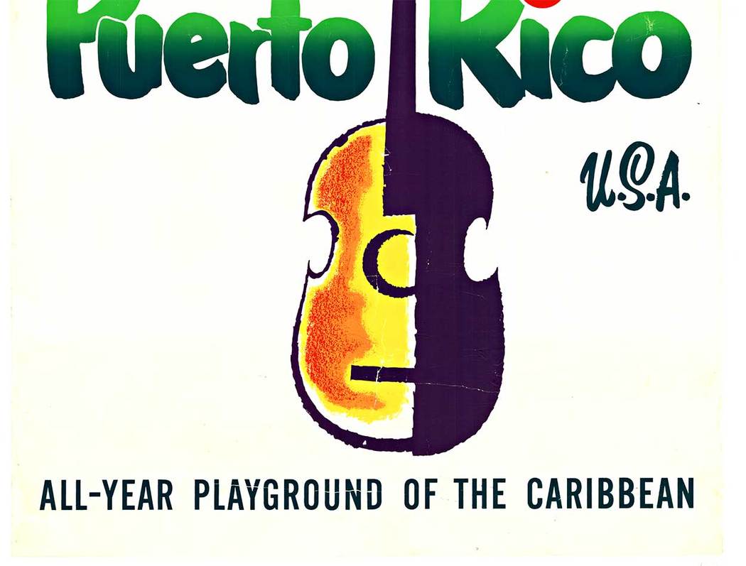 Come to Puerto Rico U.S.A. Travel Poster, Guitar and Sunhat Illustration, Linen Backed