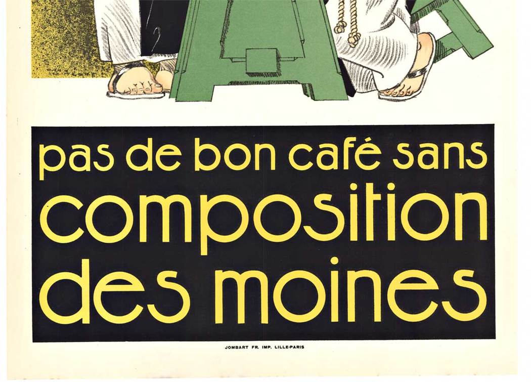 René Vincent (1879–1936) understood what Composition des Moines needed to communicate: a coffee roasted with monastic care, prepared by custodians of excellence, positioned above mass production. The typography does the heavy lifting here—that bold yellow-gold sans-serif band declaring “pas de bon café sans composition” (no good coffee without composition). It’s a guarantee wrapped in confidence. The green apparatus, rendered in clean Art Deco geometry, feels modern yet trustworthy. The brand isn’t fighting tradition; it’s modernizing it.