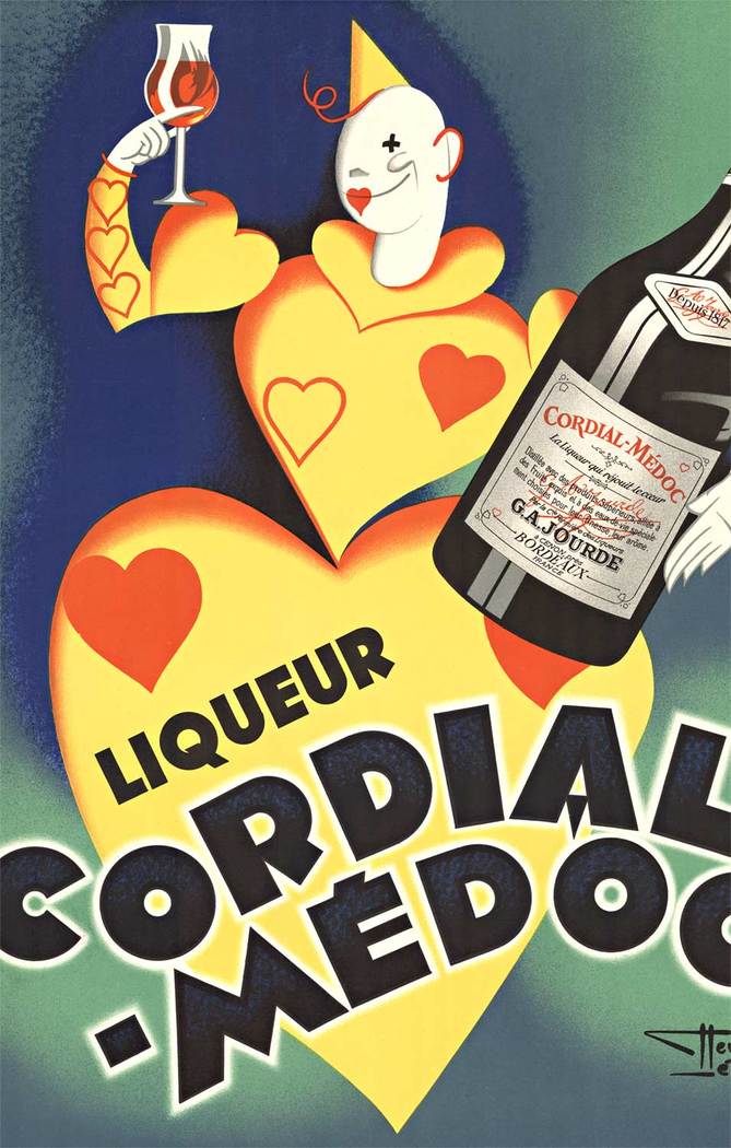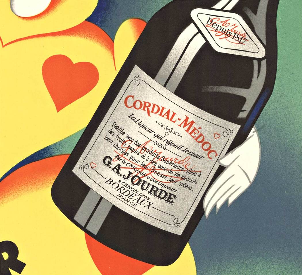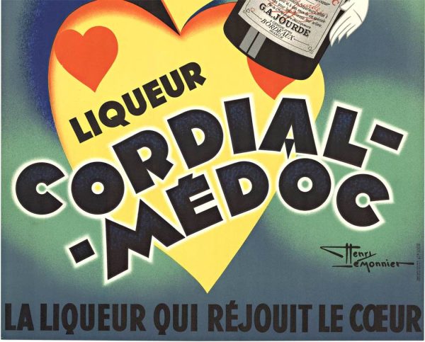 Cordial Médoc is a prestigious liqueur produced since 1878 by G. A. Jourde in Bordeaux, France. Crafted according to a closely guarded family recipe, this classic liqueur features a complex blend of more than 15 fruits, spices, and herbs, including Curaçao oranges, cocoa beans, vanilla, violets, and prunes. The poster captures the luxury and allure of this renowned Bordeaux spirit with Le Monnier’s characteristic sophisticated design sensibility.