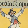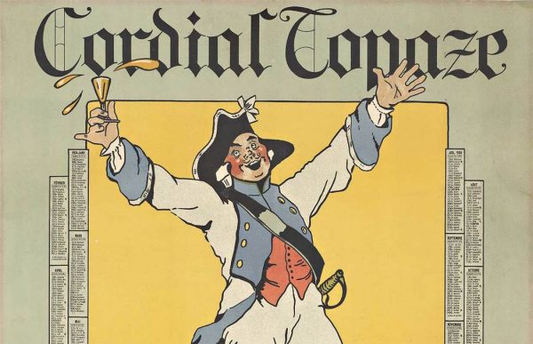 The composition is unforgettable. A triumphant Frenchman stands boldly atop a bottle of Cordial Topaze, raising a glass in celebration—a brilliant visual metaphor for the product’s quality and national pride. The vibrant yellow background electrifies the scene, while calendar dates marking 1924 frame the borders, grounding this piece in its specific moment in time.