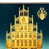The composition is both symmetrical and monumental, emphasizing stability and heritage. Decorative elements, including the crest in the upper corner, reinforce the brand’s identity and historical associations. The restrained palette enhances the clarity of form, allowing the intricate details of the building’s façade to remain legible and visually compelling.