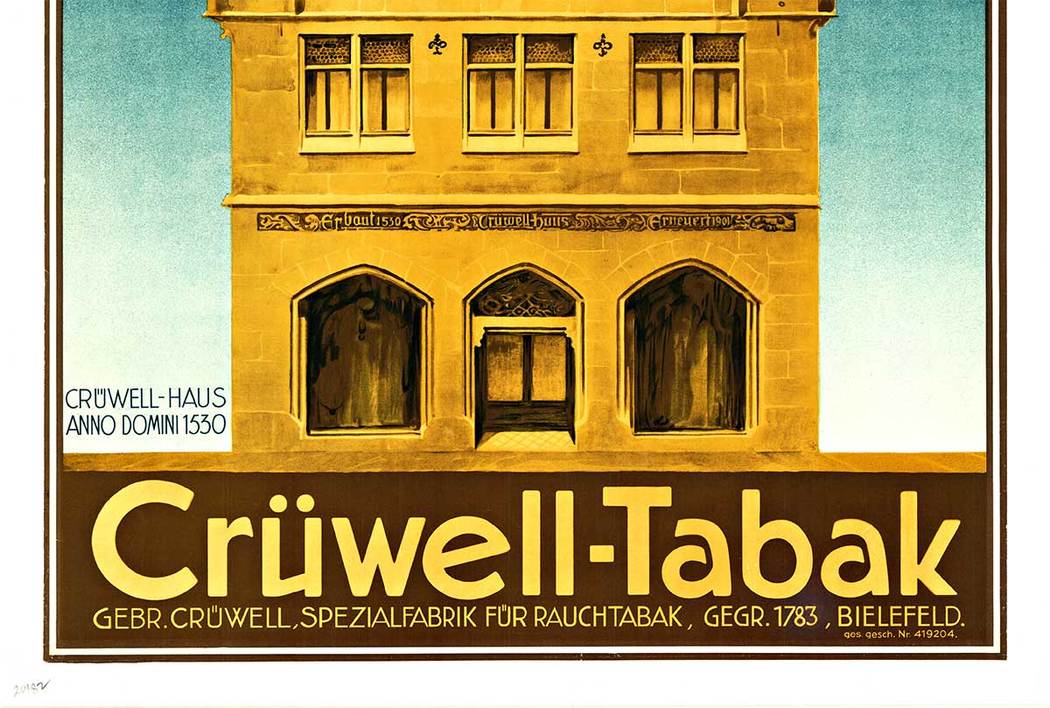 Issued by Gebrüder Crüwell of Bielefeld, a firm with origins dating back to 1705, the poster reflects a deliberate effort to align the product with a sense of enduring quality and cultural continuity. Unlike more figurative tobacco advertisements, this piece relies on architectural imagery to convey prestige and authenticity.