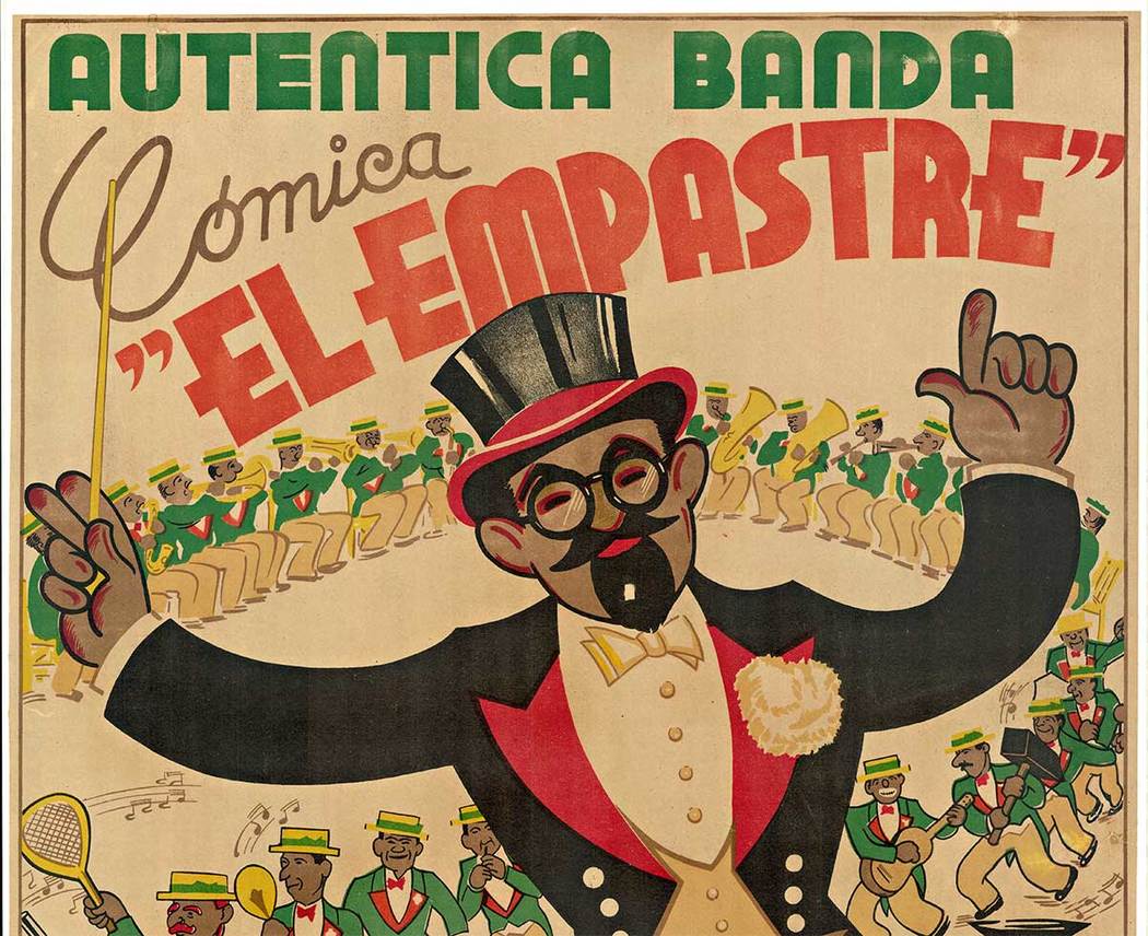 Autentica Banda Comica “El Empastre” — J Masia is an original vintage poster from the 1940’s, presented here as a vintage lithograph (not a reproduction). Printed by Mirabet in Valencia, Spain, this lively design is centered on a comedy-music ensemble known as El Empastre, a group remembered as a famous comedic performance act from Valencia in the mid-20th century.