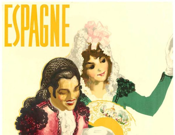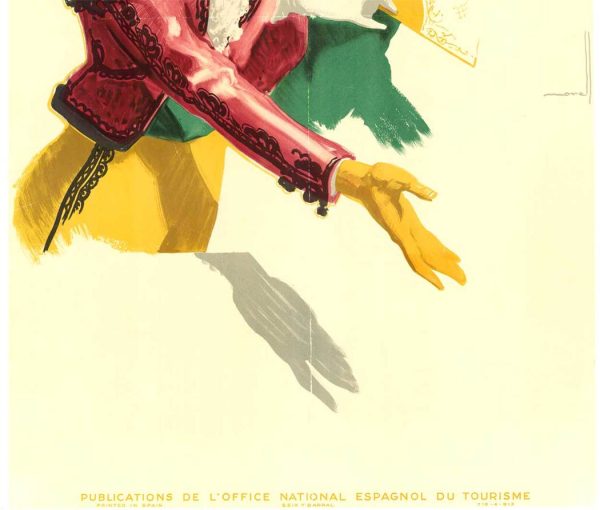 Rendered in José Morell’s distinctive Art Deco style, the figures are placed against a minimal background, allowing the dramatic costumes, movement, and expressive gestures to take center stage. The poster reflects the bold graphic language and romantic imagery used to promote Spain to international travelers during the 1930s.