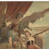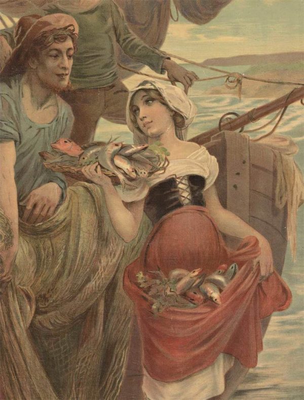 The image features a young female fishmonger as she collects part of the daily bounty in her apron from the fishermen. She looks into one of the men’s eyes as she holds a basket of additional fish as he pulls the fishing nets back into the boat.