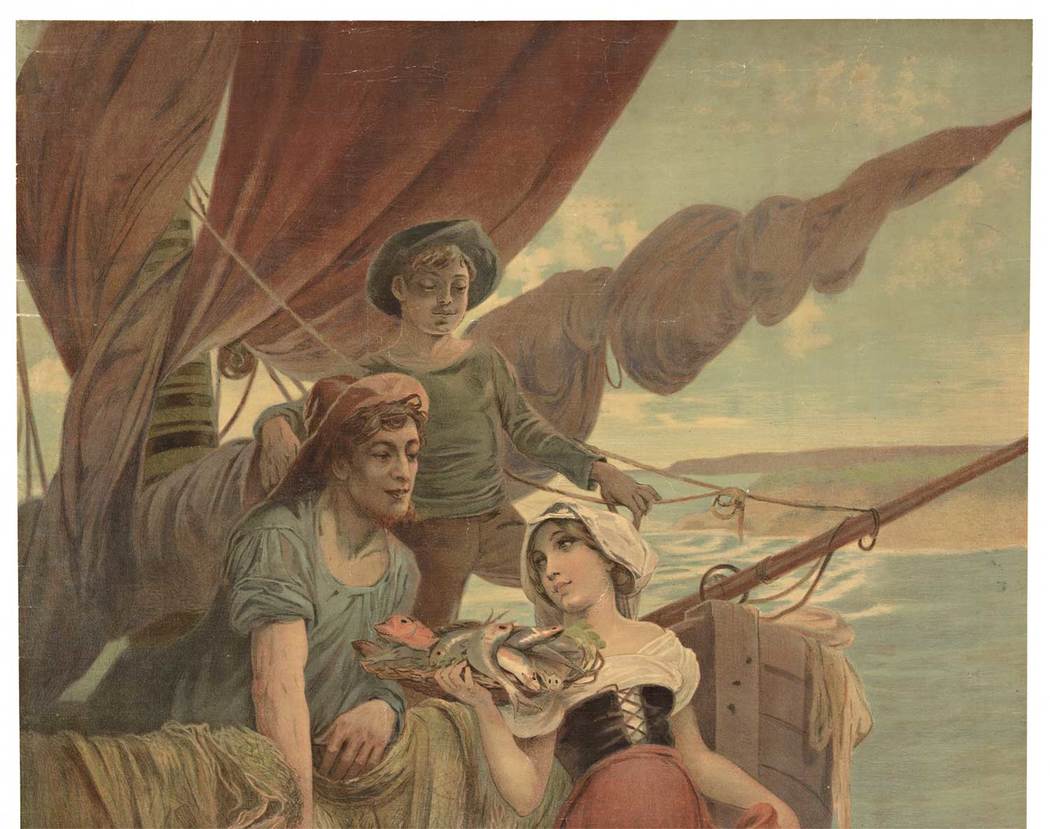 The image features a young female fishmonger as she collects part of the daily bounty in her apron from the fishermen. She looks into one of the men’s eyes as she holds a basket of additional fish as he pulls the fishing nets back into the boat.