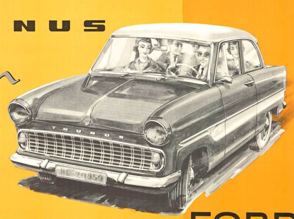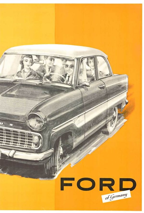 The Taunus 12M presented in 1952 was the first new German Ford after World War II. It featured ponton styling, similar in style to British Ford Zephyr. This poster features the later model from 1959. Archival linen backed in Excellent condition (A), ready to frame.