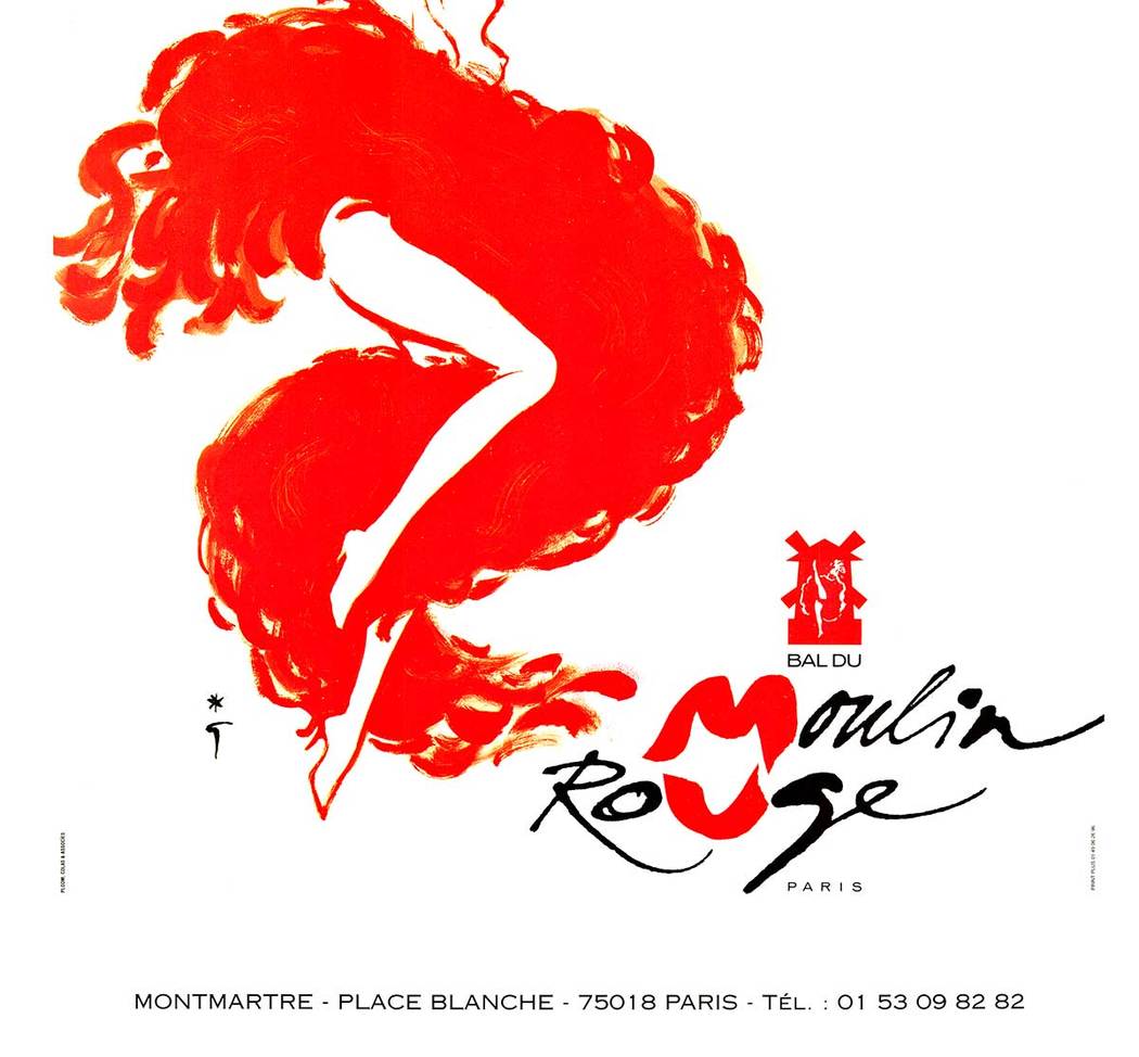 Own an original Moulin Rouge vintage poster by René Gruau. This small-format lithograph captures the electric energy of Paris’s most legendary cabaret. Red ribbons and bold black lines form a striking silhouette. The can-can dancer captures motion and elegance perfectly.
