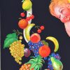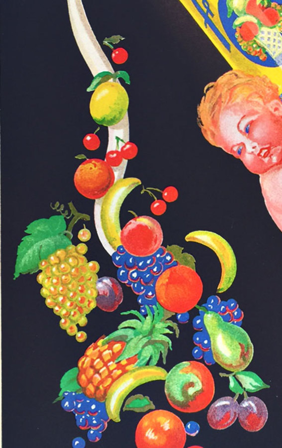 Notice how Fehr captures motion and personality in minimal strokes. The cherub’s body curves with the tube’s arc; his expression radiates childlike delight. The fruit arrangement guides the eye downward in a natural cascade, while the bold navy background makes every color sing without distraction. This is economical design mastery—every element earns its place. The composition balances playfulness with commercial clarity: you know exactly what’s being sold, and you want it.
