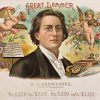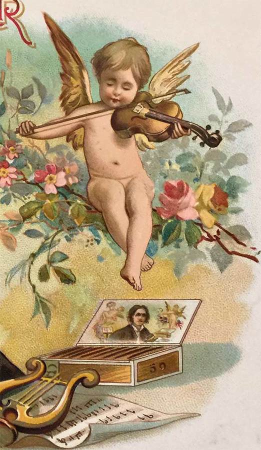 Great Leader original cigar box label. A cherub plays a tambourine on the left and a violin on the right. A music harp rests down near a box of Great Leader cigars. Very rare.