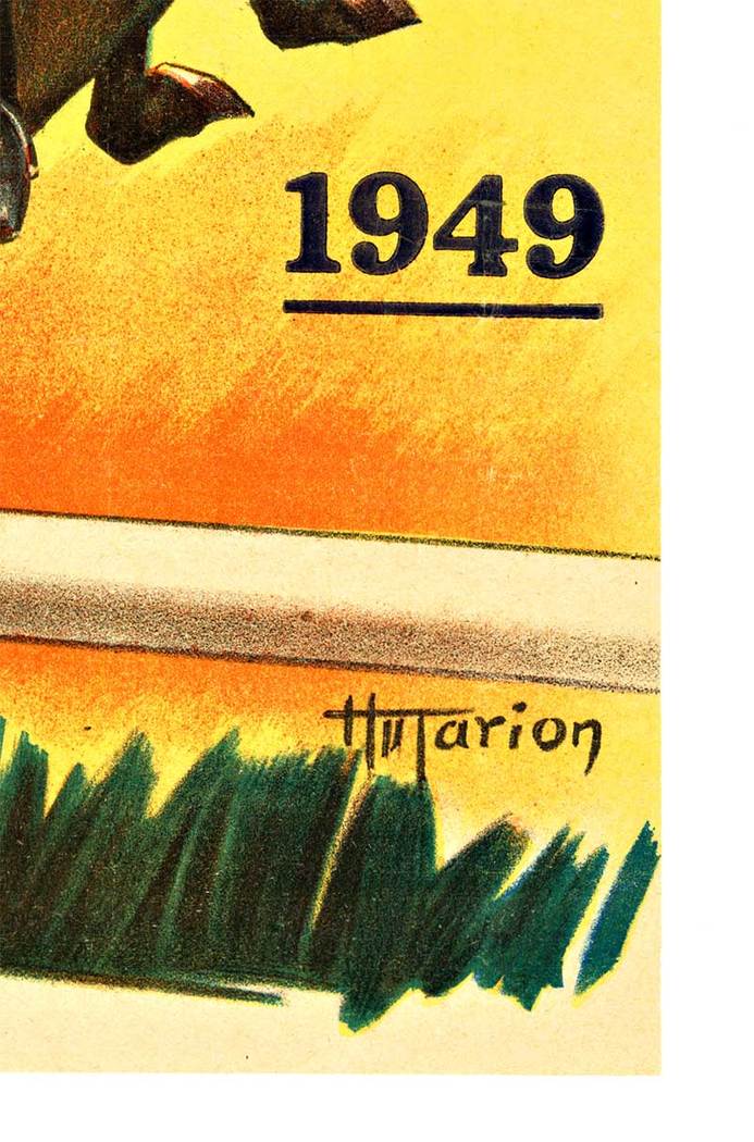The bold color blocking and simplified forms reflect mid-century lithographic design at its most direct, using motion and contrast to convey speed and competition. Issued for one of Belgium’s oldest equestrian institutions, this piece sits at the intersection of sporting culture and graphic modernism.