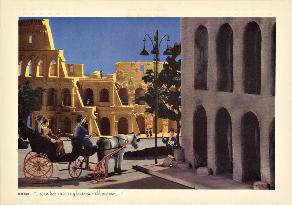 The image was created using Werner’s distinctive diorama technique, in which miniature architectural models and landscapes were carefully constructed and then photographed. Through skillful lighting and perspective, these elaborate miniature sets produced remarkably lifelike scenes that became a signature feature of TWA’s advertising during the golden age of aviation.