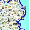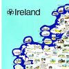 The strong coastal outline, rendered in deep blue, establishes a clear boundary that contains an active interior. Within it, castles, abbeys, towns, and landscapes are depicted in a consistent, approachable graphic style that compresses historical time into a single continuous present. This flattening allows medieval architecture, folklore references, and modern life to coexist without hierarchy, reinforcing a sense of Ireland as layered but unified.