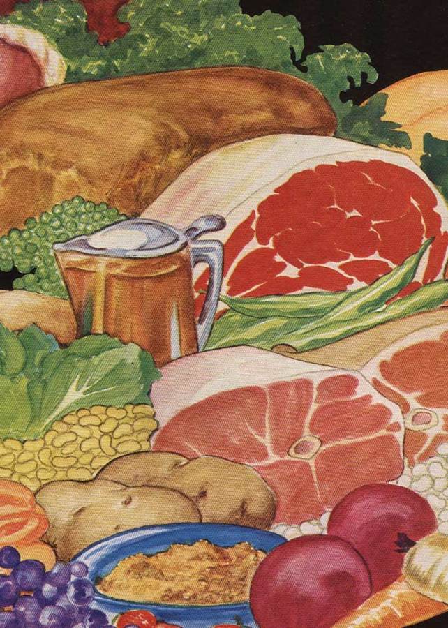 Notice how Cox refines his visual language with each successive poster—here the arrangement feels almost ancestral, foods organized as if for an ancient ritual. The meats anchor the composition with authority while supporting players (vegetables, legumes, eggs) create narrative and rhythm. The typography remains confident and direct, the black background deepens in visual presence, the overall effect becomes increasingly sophisticated. This is an artist reaching peak mastery within a series, each piece learning from what came before.