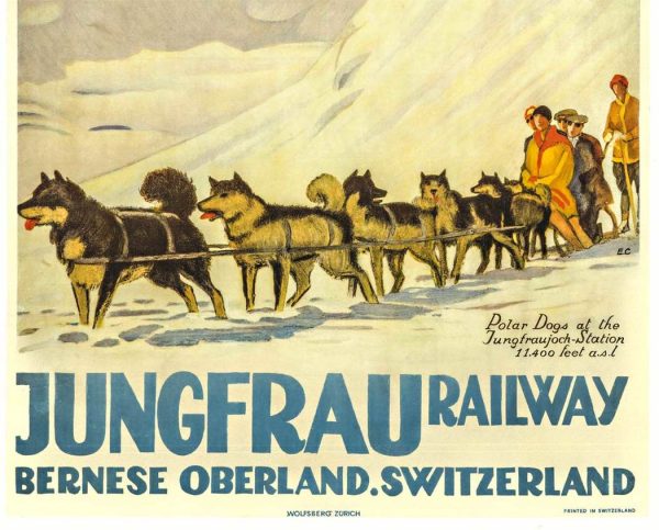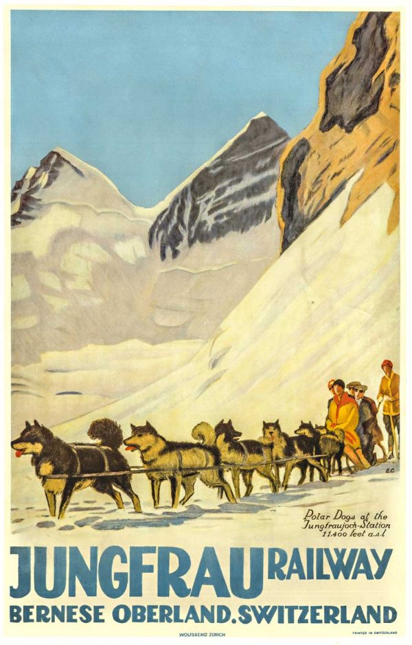Cardinaux is regarded as one of the pioneers of Swiss poster design, known for distilling alpine landscapes into bold, simplified compositions. This poster reflects the early promotion of the Jungfrau Railway, an engineering achievement that brought travelers to the Jungfraujoch—“Top of Europe.” The inclusion of a dog sled team underscores the region’s winter allure and sense of expedition, aligning tourism with both comfort and adventure.