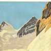 Emil Cardinaux captures the Bernese Oberland in winter with a dynamic dog sled team cutting across a vast alpine expanse beneath towering peaks. The composition emphasizes scale and isolation, with sweeping سفید snowfields contrasted against sharply defined पर्वत ridges, creating both movement and stillness. Designed to promote the Jungfrau Railway, the image highlights the region’s sense of adventure and accessibility at a time when alpine tourism was rapidly expanding. Cardinaux’s restrained palette and confident forms place the work among the defining early Swiss travel posters.