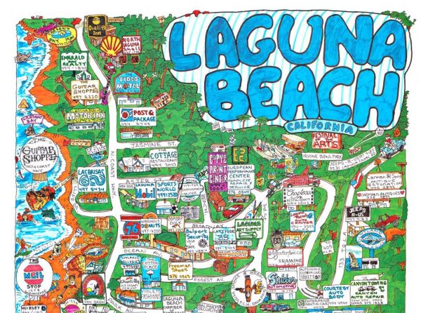 This 1998 illustrated map of Laguna Beach approaches place-making through detail and personality rather than distance or scale. Packed with hand-drawn buildings, local businesses, winding roads, and labeled landmarks, the composition reads less like a navigational tool and more like a visual inventory of a coastal town at a specific moment in time.