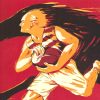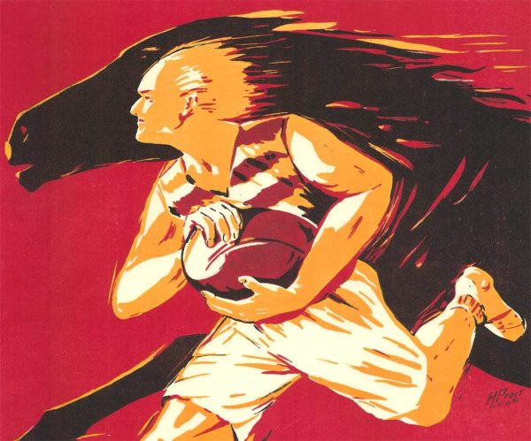 A powerful late Art Deco composition depicting a muscular rugby player in full stride, visually paired with the silhouette of a galloping horse behind him. The figure is rendered in bold, angular forms with a restricted palette of ochre, black, and deep red, creating a sense of speed and physical intensity. The overlapping horse amplifies the theme of strength and endurance, fusing athletic performance with symbolic power.
