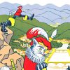 The whimsical illustration presents a colorful medieval‑inspired scene overlooking the town and the surrounding landscape. In the foreground, a playful armored figure with a feathered helmet gestures toward the valley below, while another traveler rides through the hills above. Beyond them lies the picturesque town of Épinal, with its river, forests, and historic architecture nestled among the Vosges mountains.