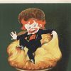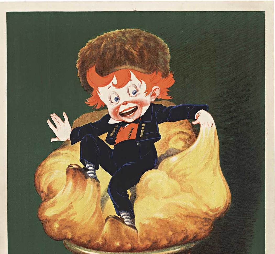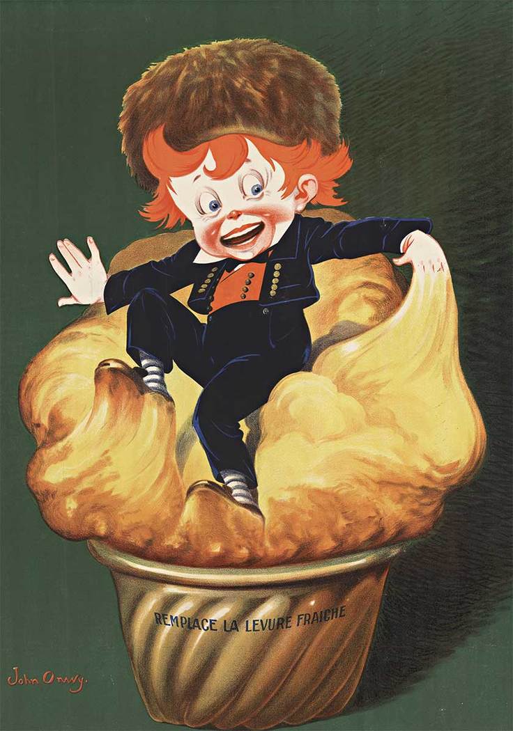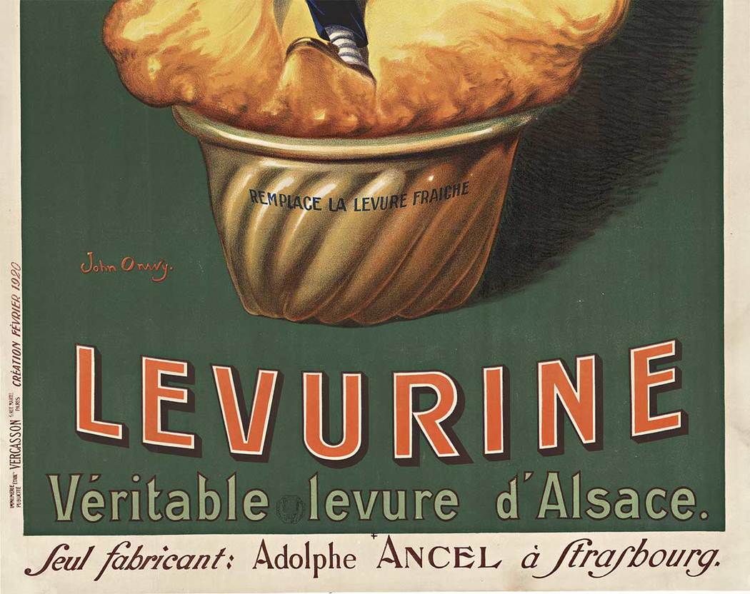 A singular and enchanting artifact of early 20th-century French commercial artistry: this 1920 Levurine poster by John Onwy is one of the most elusive examples of interwar kitchen-product advertising. Levurine, a revolutionary baking yeast that promised superior rise and golden-brown results, becomes in Onwy’s hands not merely a functional ingredient but a source of pure culinary joy—embodied in the figure of a delighted red-haired boy, gleefully ensconced atop an enormous baking tin that has expanded to cradle him like a throne.