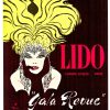 The image of an elegant woman in her cabaret headdress, long black gloves, and a pink finger near the edge of her mouth is watching you. Entertainment at the Lido will also feature the 30 Bluebell Girls, 10 New Attractions, and beautiful nudes.