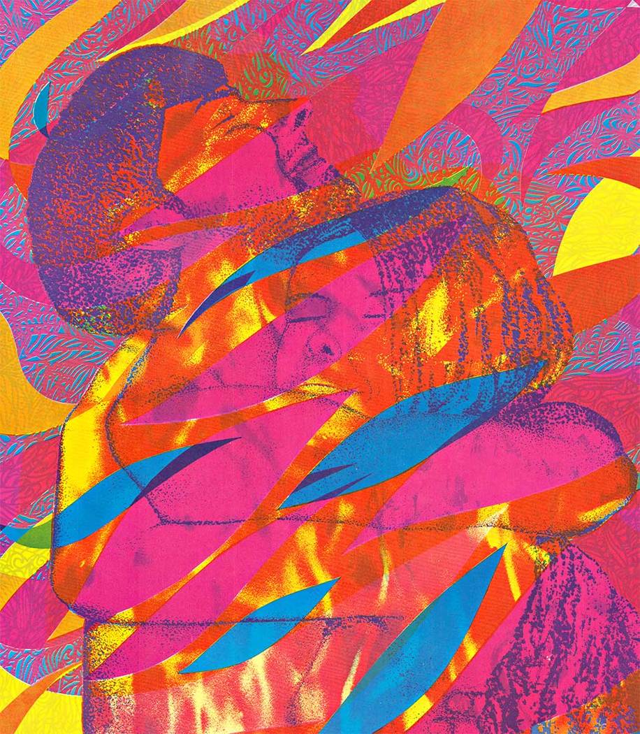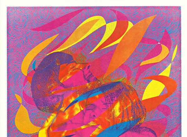 Original 1967 counterculture-era graphic by Paul Olsen, presented as a standout example of psychedelic design sensibility, featuring an embrace scene with flame-like forms and a highly energetic color field.