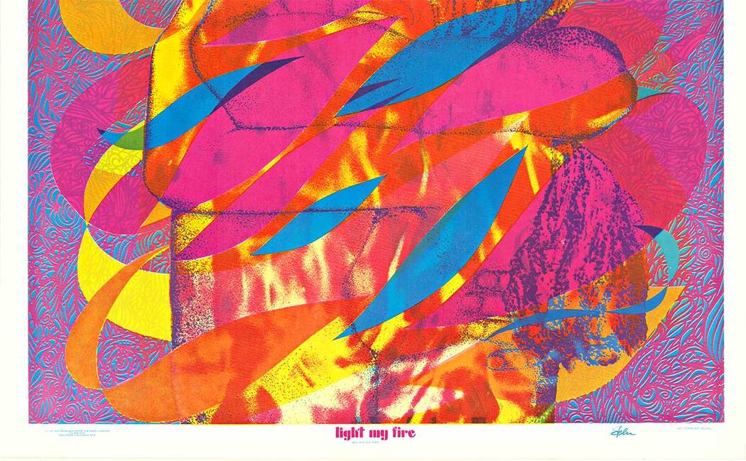 This original 1967 “Light My Fire” (Keep In A Cool Place) poster by Paul Olsen is a vivid, late-1960s tribute to the revolutionary counterculture—and to the kind of bold, psyche-lifting pop imagery that helped define the era. The composition features a man and woman in an embrace, surrounded by swirling, flame-like forms that feel alive with motion. The explosive color palette and dynamic, abstract shapes capture the electricity of the moment, while the central figures ground the artwork with intimacy and impact.