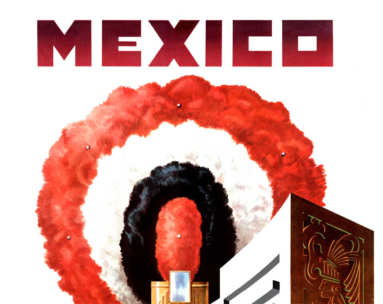 This original vintage travel poster beautifully reflects the excitement of international travel promoted by American Airlines in the mid‑20th century. The dynamic composition, rich colors, and cultural symbolism make it a standout piece of collectible travel poster art celebrating Mexico’s heritage, architecture, and tropical landscapes.