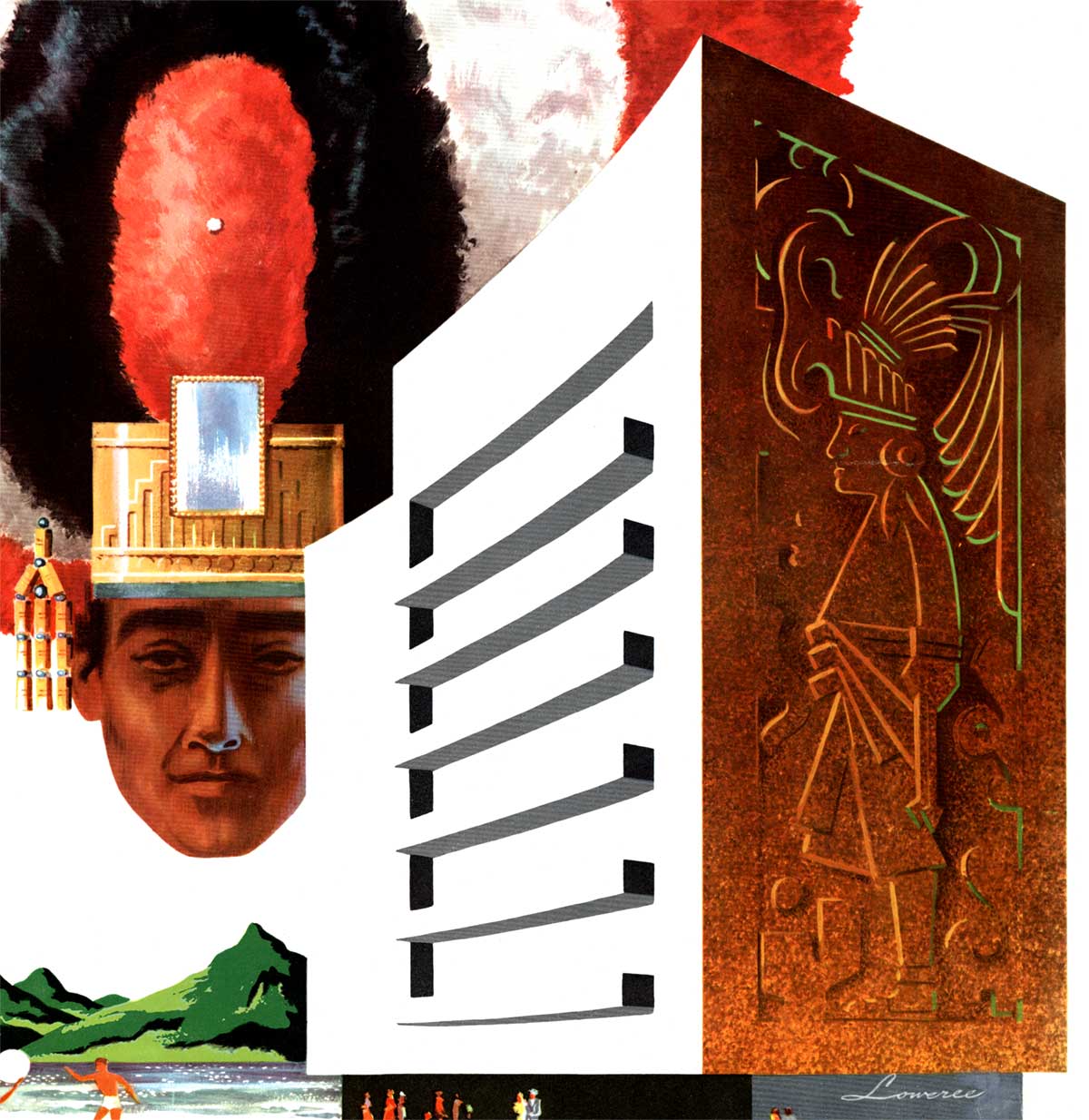 Original Mexico American Airlines vintage travel poster, a striking example of mid‑century travel advertising promoting tourism to Mexico during the golden age of air travel. This authentic original lithograph vintage poster features bold, colorful artwork combining traditional Mexican culture with modern architectural design. The centerpiece shows a man wearing an elaborate ceremonial headdress, while a modern building with a large Mayan glyph stands beside him. Below, beachgoers relax along the shoreline with sailboats, turquoise water, and distant mountains completing the vibrant coastal scene.