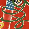 - Set against a vivid red field, a pair of inverted legs takes center stage, wrapped in loose ribbons of yellow, green, and blue that curl and loop across the surface. The shoes and patterned socks add small bursts of detail, while scattered dots and floral shapes echo the playful rhythm of the streamers. The lettering above sits lightly, allowing the movement below to carry the composition.