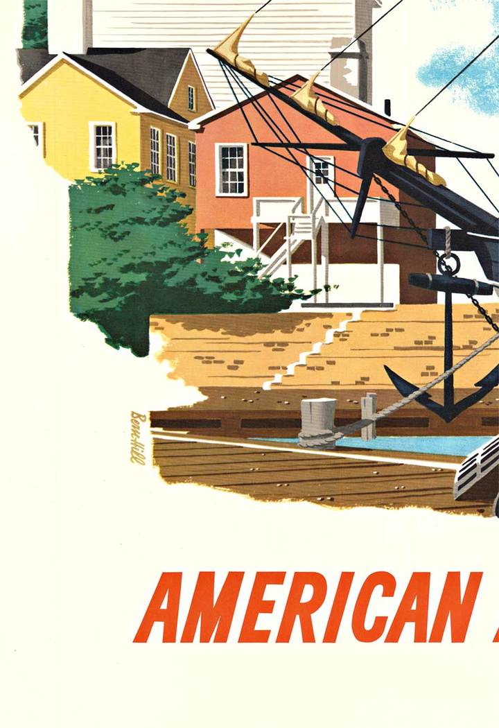 This original vintage poster from the 1950s captures the essence of New England and American Airlines’ flights to the region. Designed by Bern Hill, this artwork showcases a serene image of a ship docked at port and a majestic bell tower, depicting the charm and beauty of New England. Perfect for collectors or those who admire vintage aesthetics, this poster is a unique piece of history that will add character to any space.