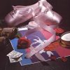 A refined and evocative United Airlines travel poster promoting New York as a destination for culture and performance. The composition centers on a carefully arranged still life of ballet slippers, theatre tickets, opera glasses, a rose, and stage makeup, all resting against a softly lit backdrop that suggests the atmosphere of backstage preparation and live performance.