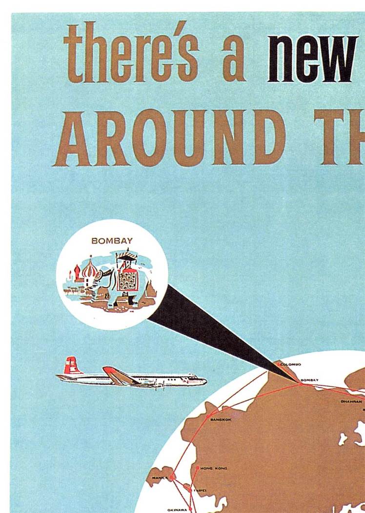 - A simplified globe sits at the center, its continents rendered in warm brown against a pale blue field, with thin red routes tracing long arcs across the oceans. Four circular vignettes—New York, Tokyo, Bombay, and Rome—radiate outward, each connected back to the map with dark graphic beams that draw the eye across the composition. Two mid-century aircraft glide along the edges, reinforcing the sense of distance being quietly bridged.
