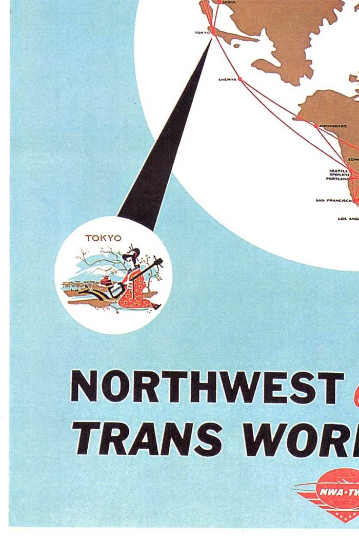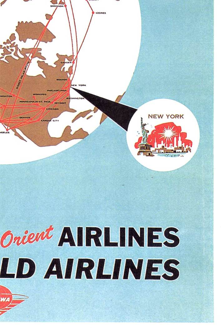 The layout feels open and deliberate, with plenty of space around the central form, giving the piece a calm, expansive quality. The lettering is minimal and direct, letting the imagery carry most of the message. It reflects a moment when global air travel was still new enough to feel both ambitious and carefully mapped.
